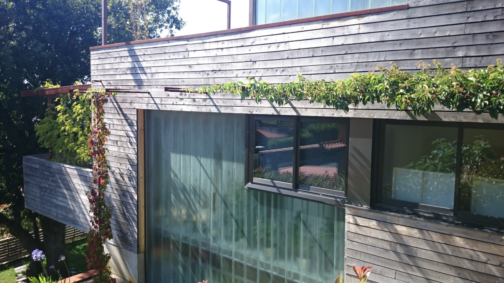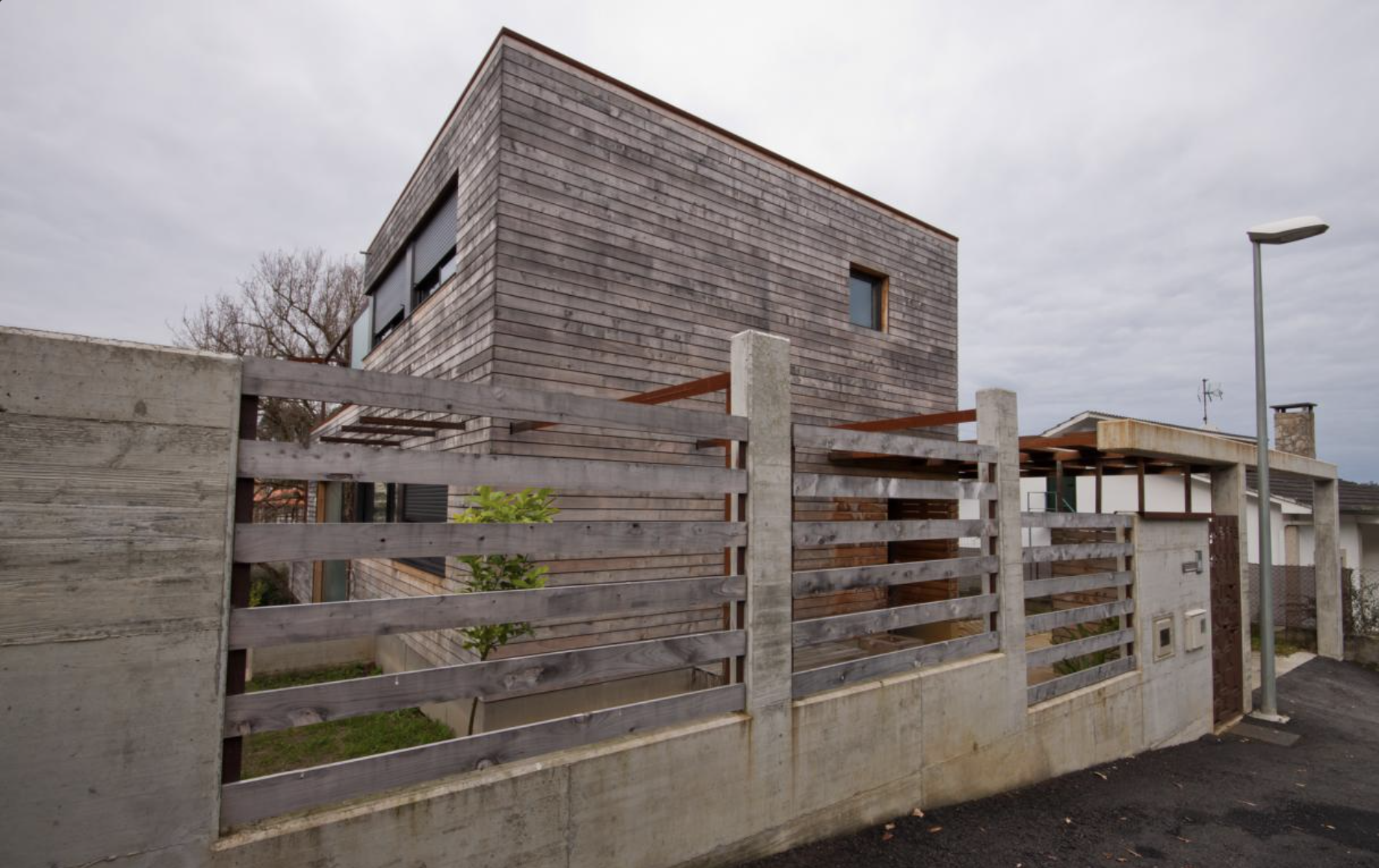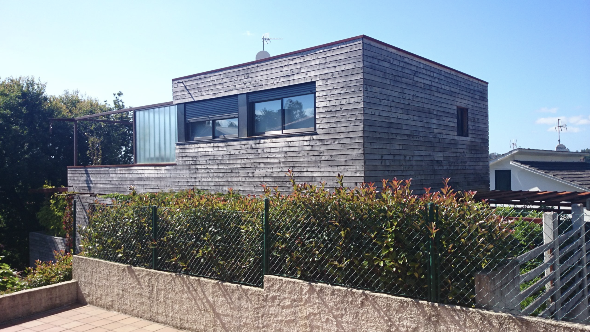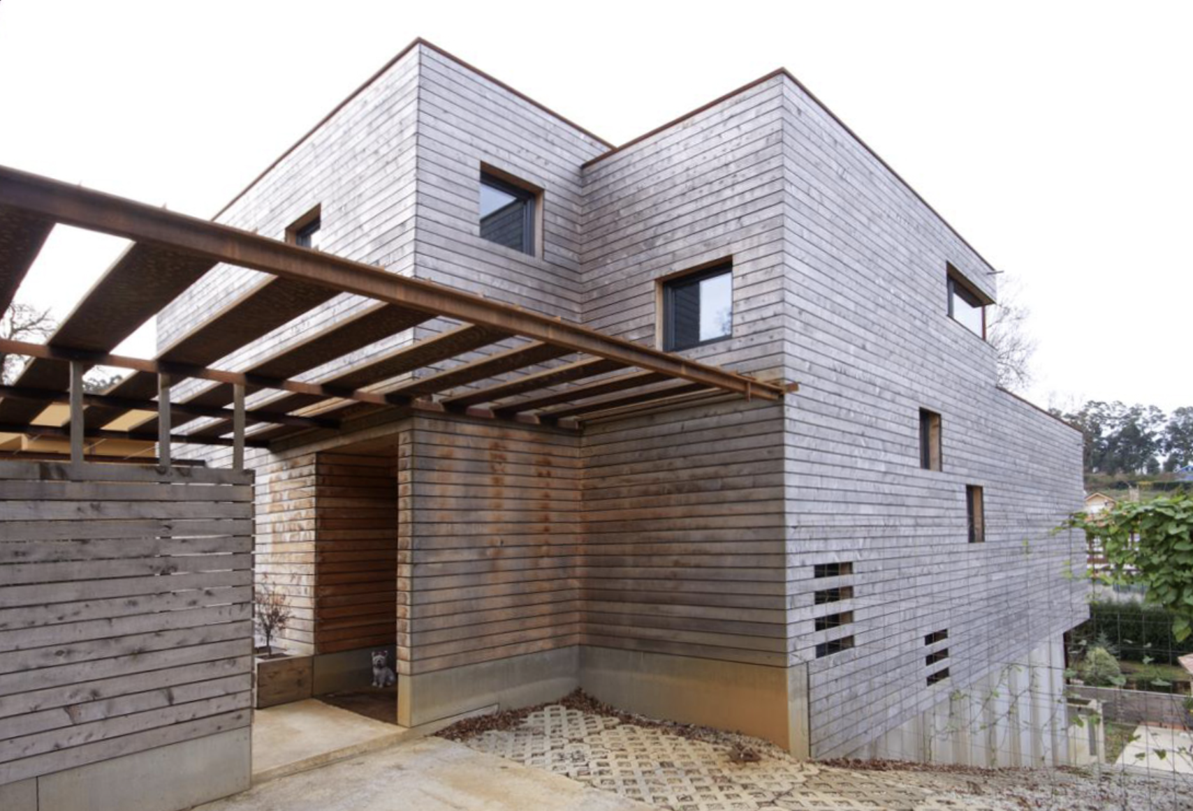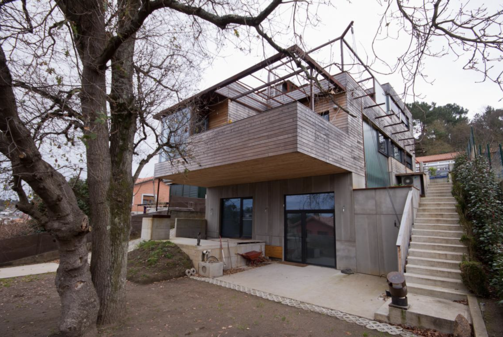 Vivienda con volumen escalonado adaptándose al gran desnivel del terreno. Se respeta un roble centenario que condiciona el diseño de la vivienda. Fachada ventilada de ciprés y Viroc. Calificación energética A.