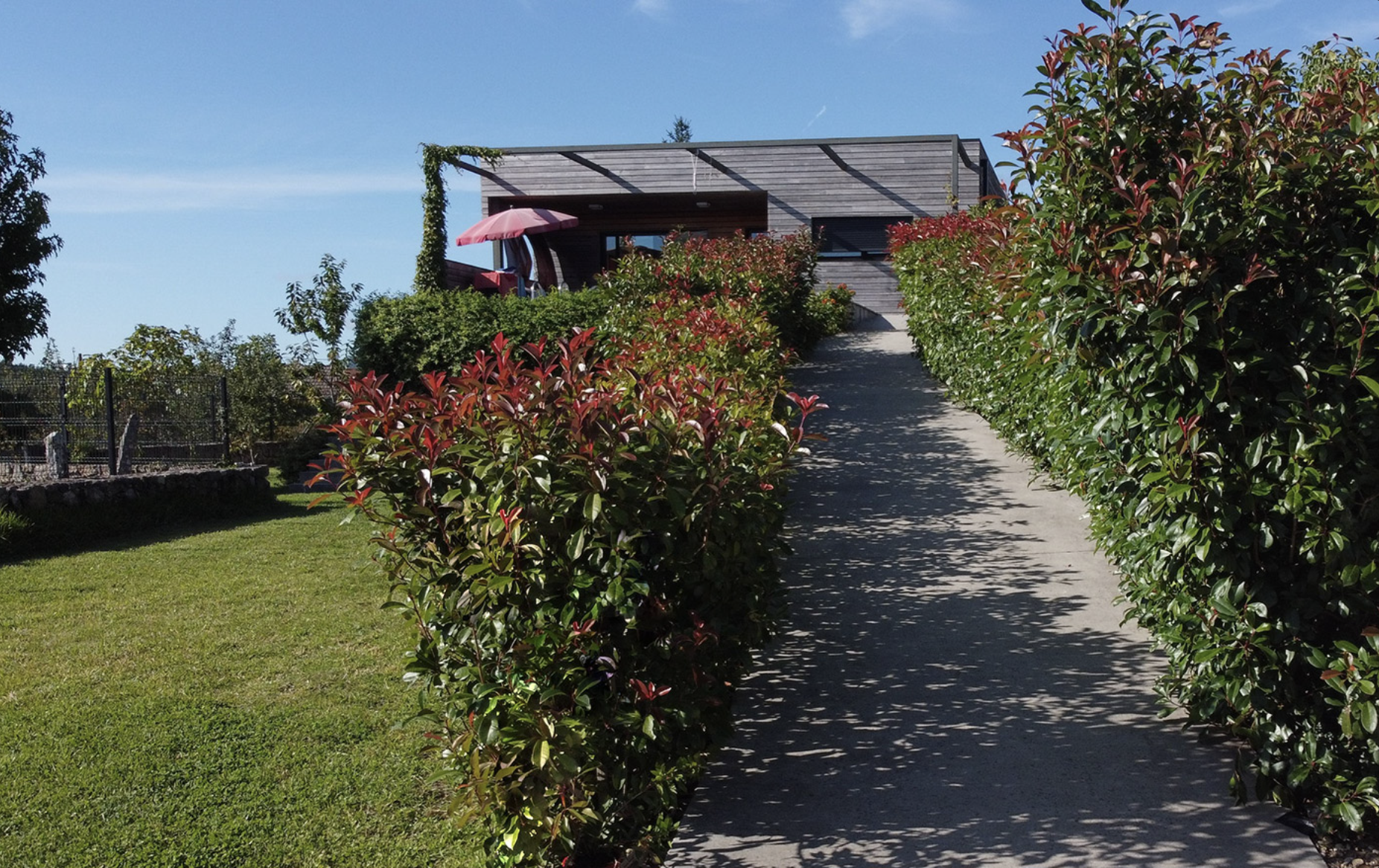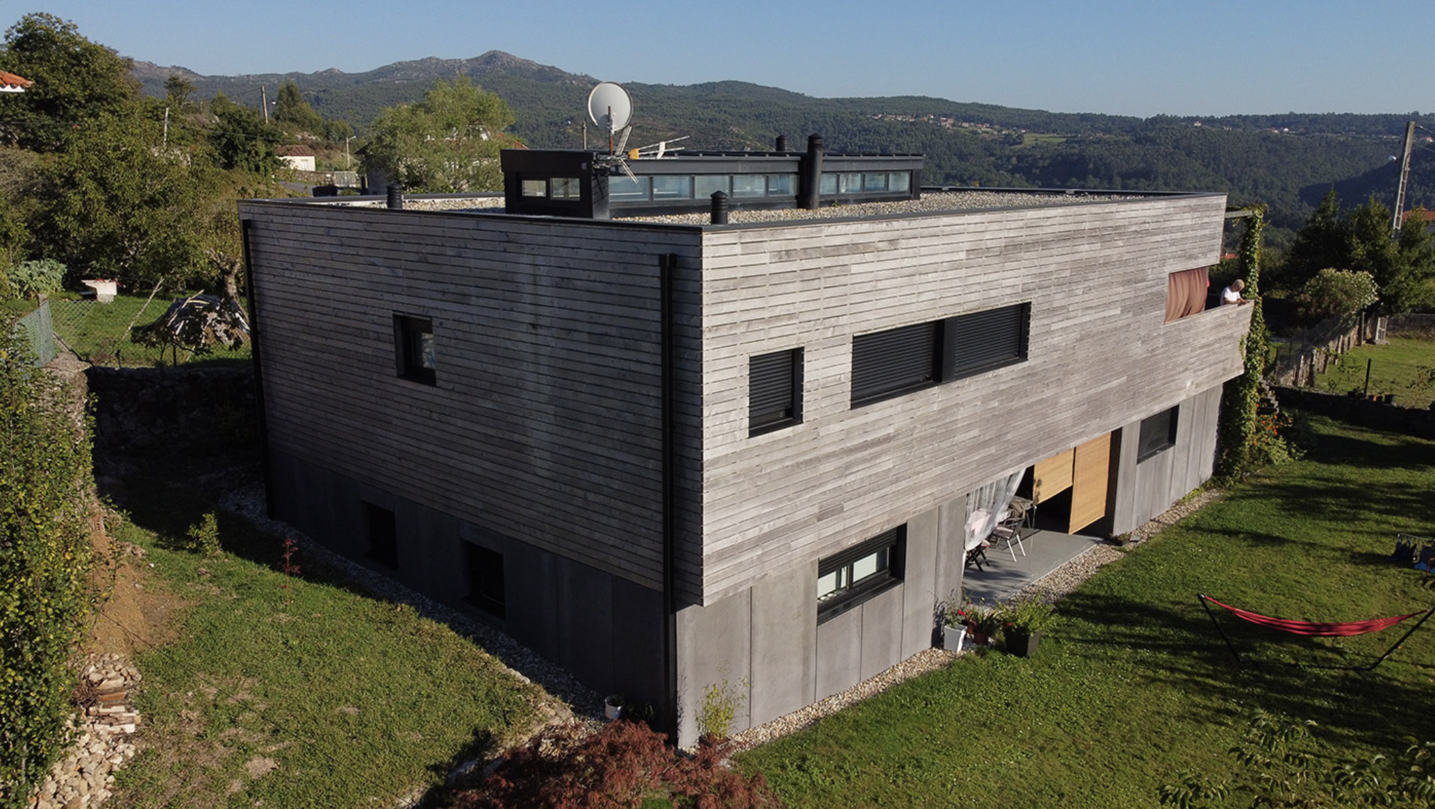Vivienda en núcleo rural con fachada ventilada de ciprés y Viroc. Calificación energética A.